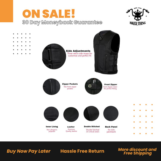 Men's Black Bullet Proof Style Leather Vest with Straps on Side