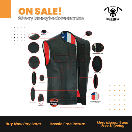 MEN’S LEATHER VEST WITH RED STITCHING AND USA INSIDE FLAG LINING