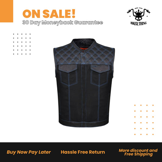 Mens Black Club Vest Diamond Design Blue Thread Leather & Denim