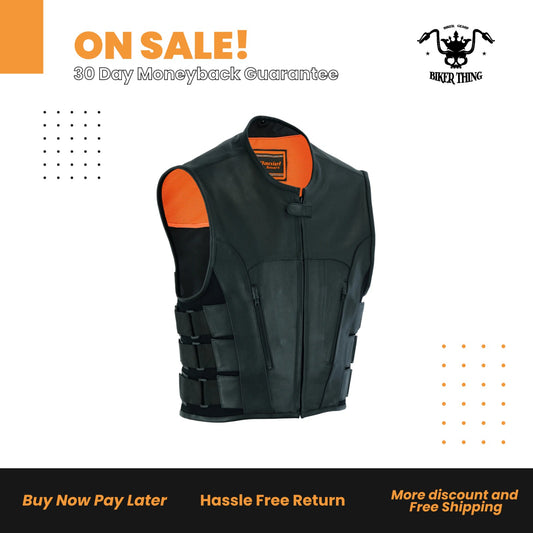 Men's Black Bullet Proof Style Leather Vest with Straps on Side