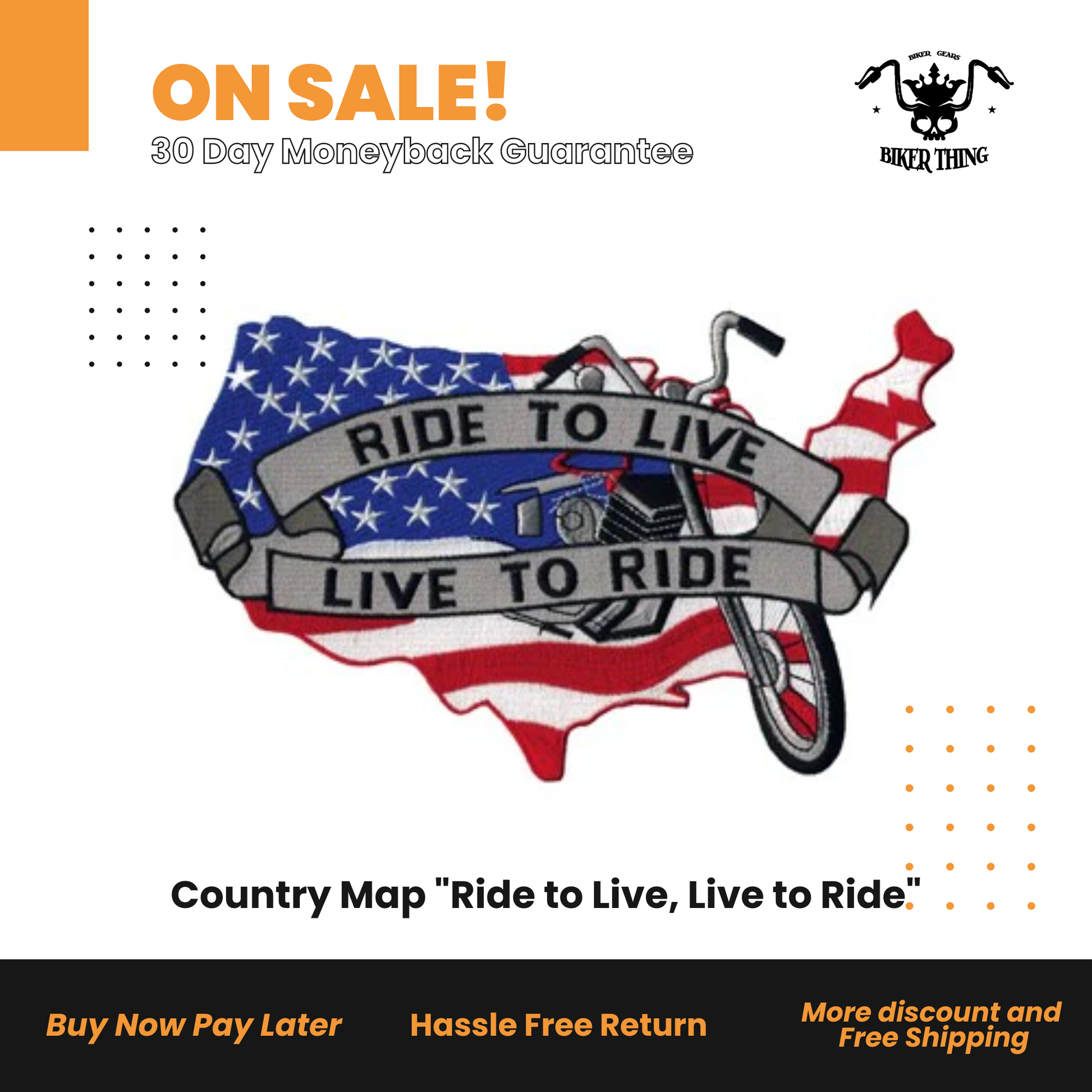 Patriotic patch of the United States with motorcycle going through it and the words "Ride to Live, Live to Ride" in a banner. Patch measures 6" x 9.5"