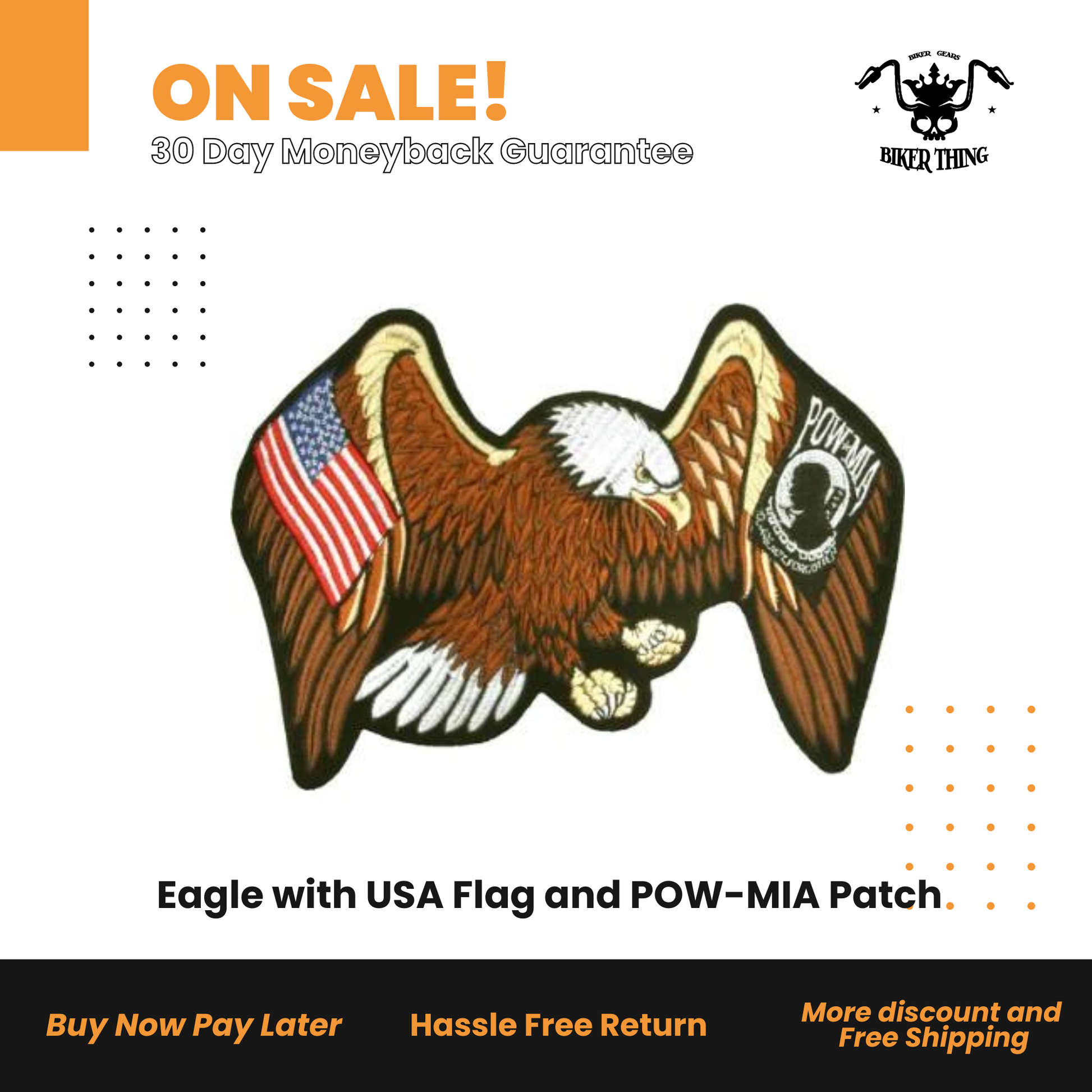Patriotic patch with eagle with its wings spread out and showing American flag and P.O.W logo on each wing. Patch measures 9" x 13"