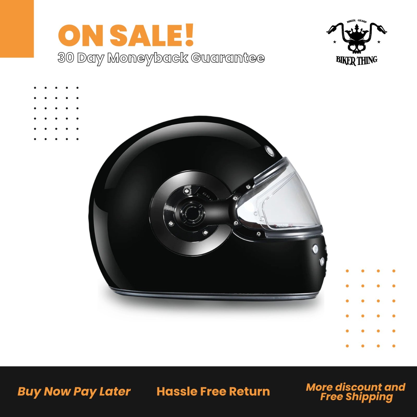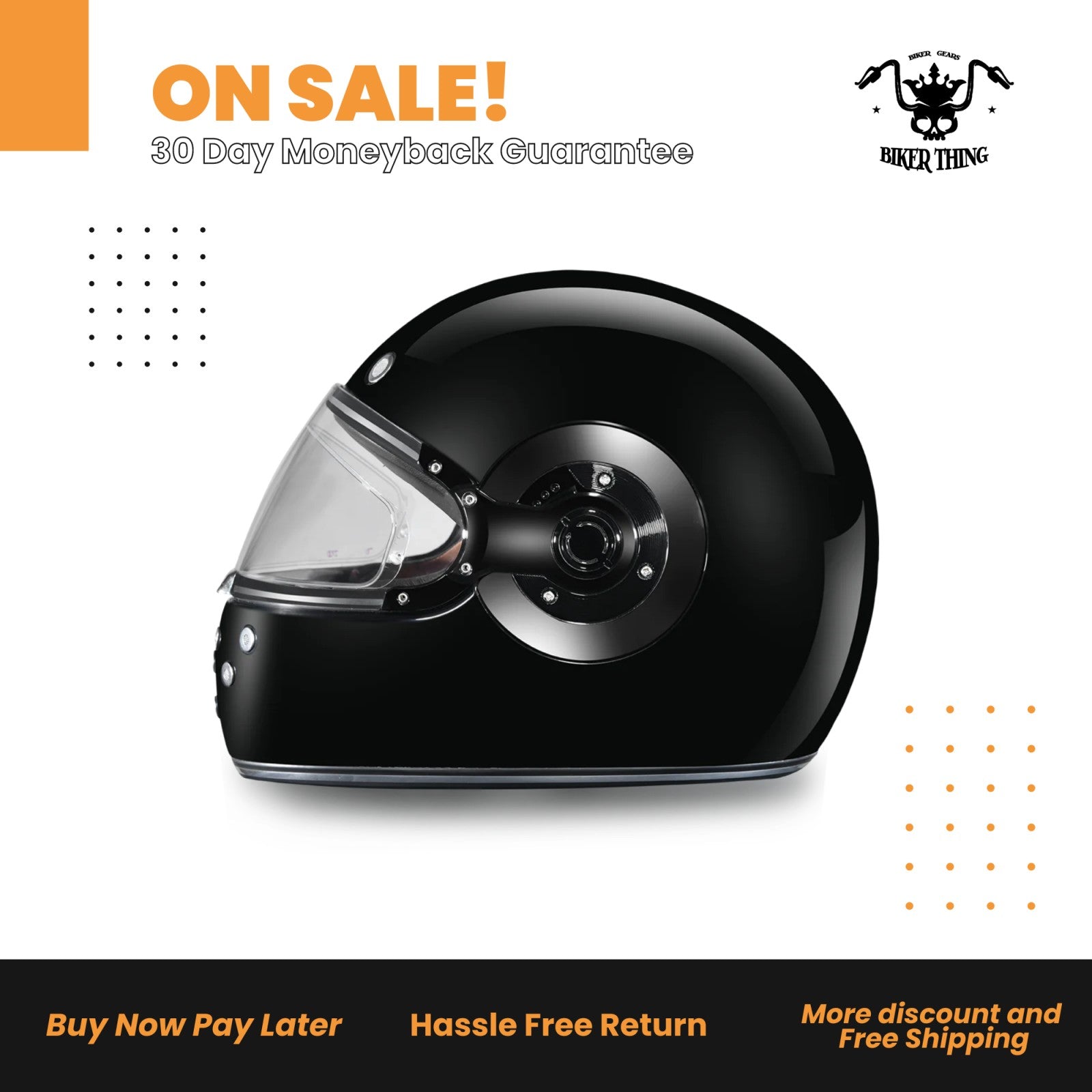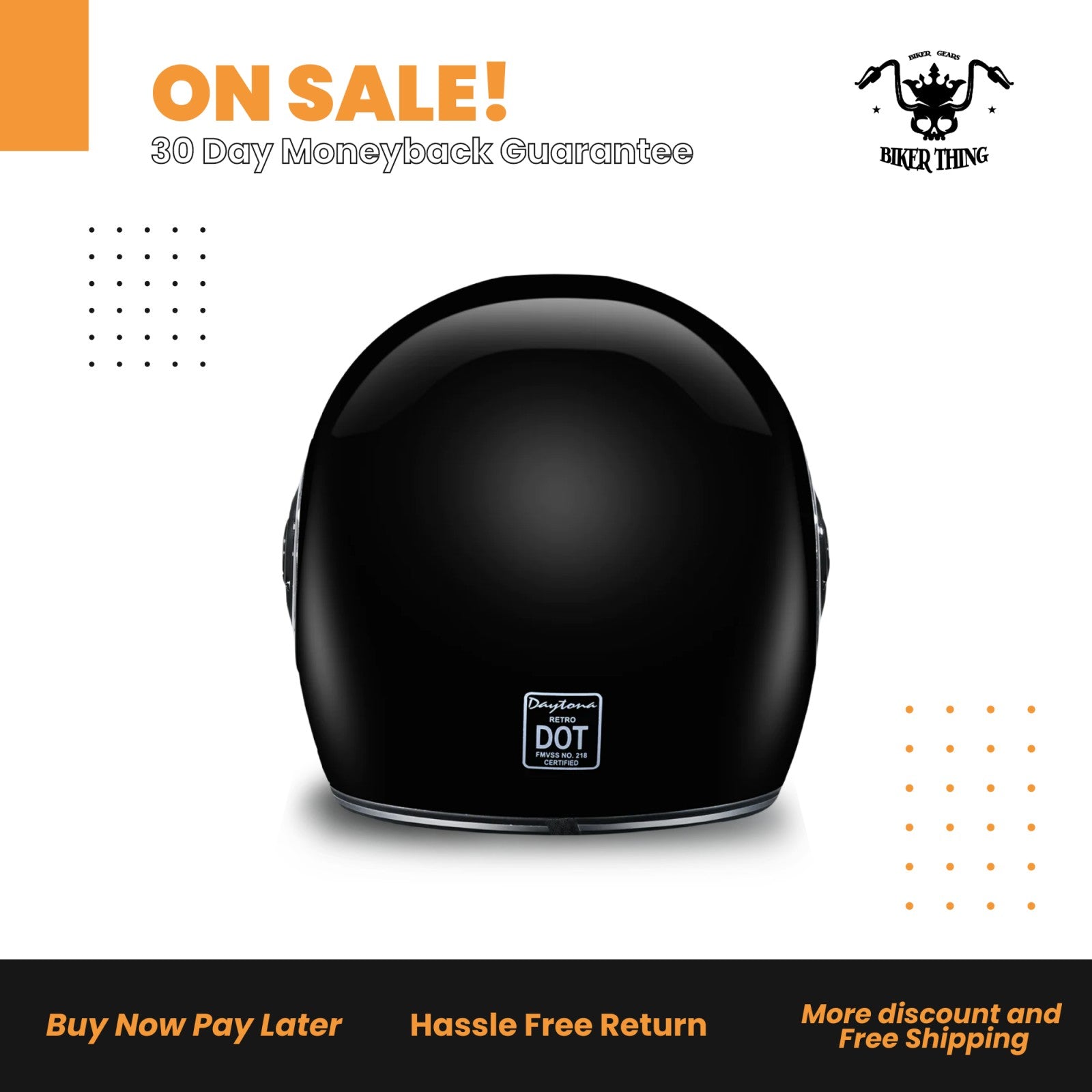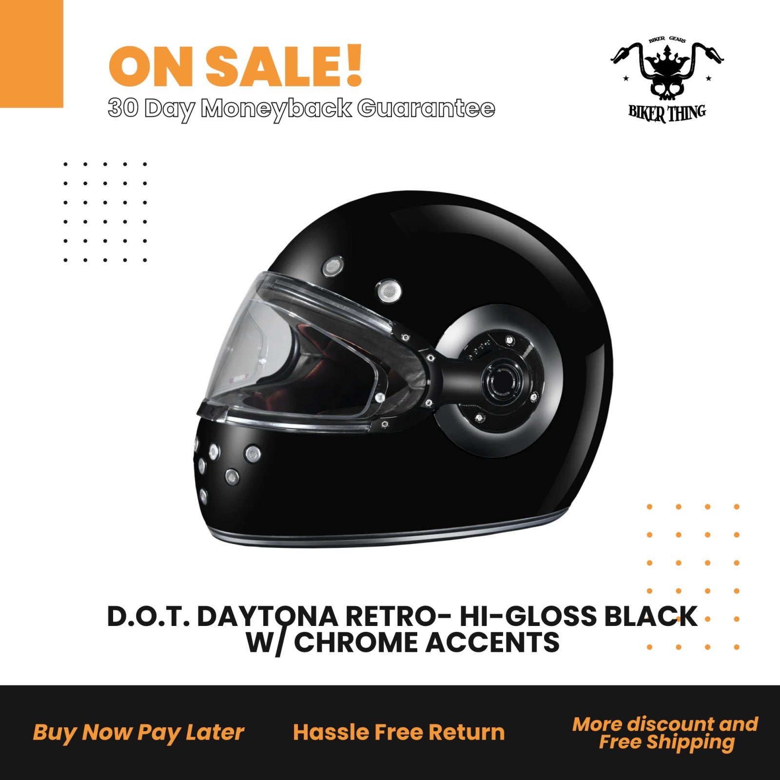 Our D.O.T. Daytona Retro Full Face Helmet In A Hi-Gloss Black With Chrome Accents, Meets And Exceeds D.O.T. FMVSS 218 Standards. With 2 Different Shell Sizes, You're Sure to Get That Proportionate Fit!! The Retro Has The Classic Vintage Look Of Yesterday. Features A Vintage Outer Anti-Scratch, Pinlock 70-R Fitted Clear Shield. Also Has A Nylon Strap D-Ring Retention System, Chin And Forehead Ventilation And A Removable, Hand Washable Interior (Moisture Wicking Fabric) With Premium Interior Leather Accents. Free Head Wrap And Draw String Bag Included. Sizes Range From XS-2XL.