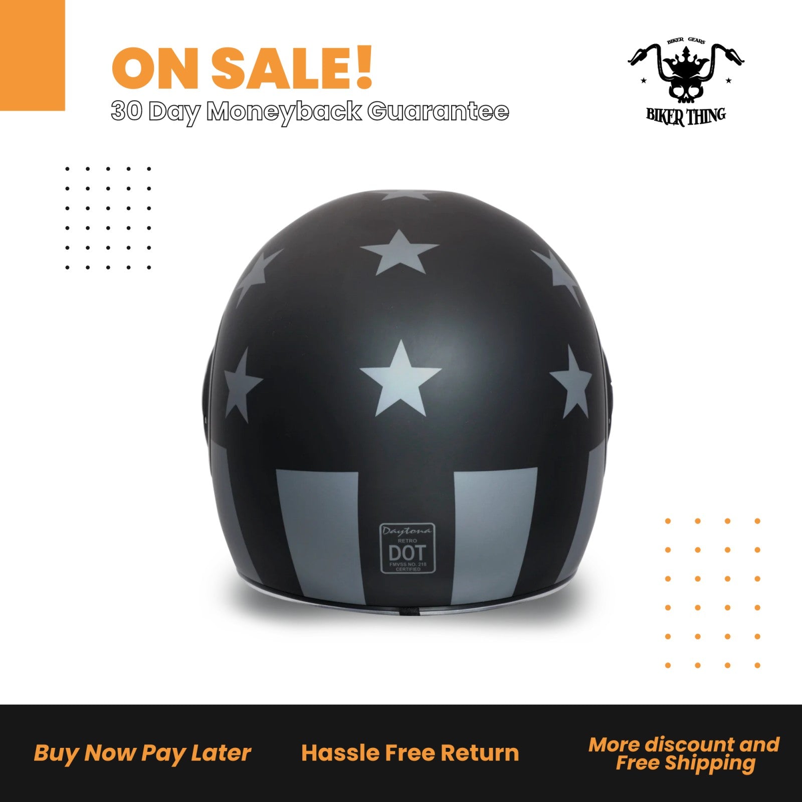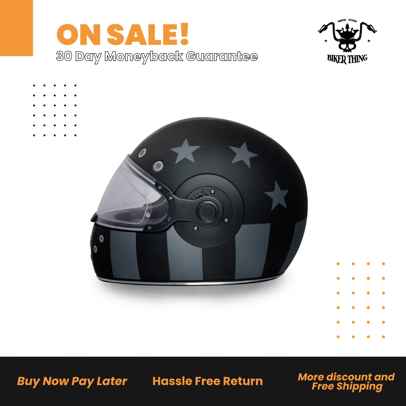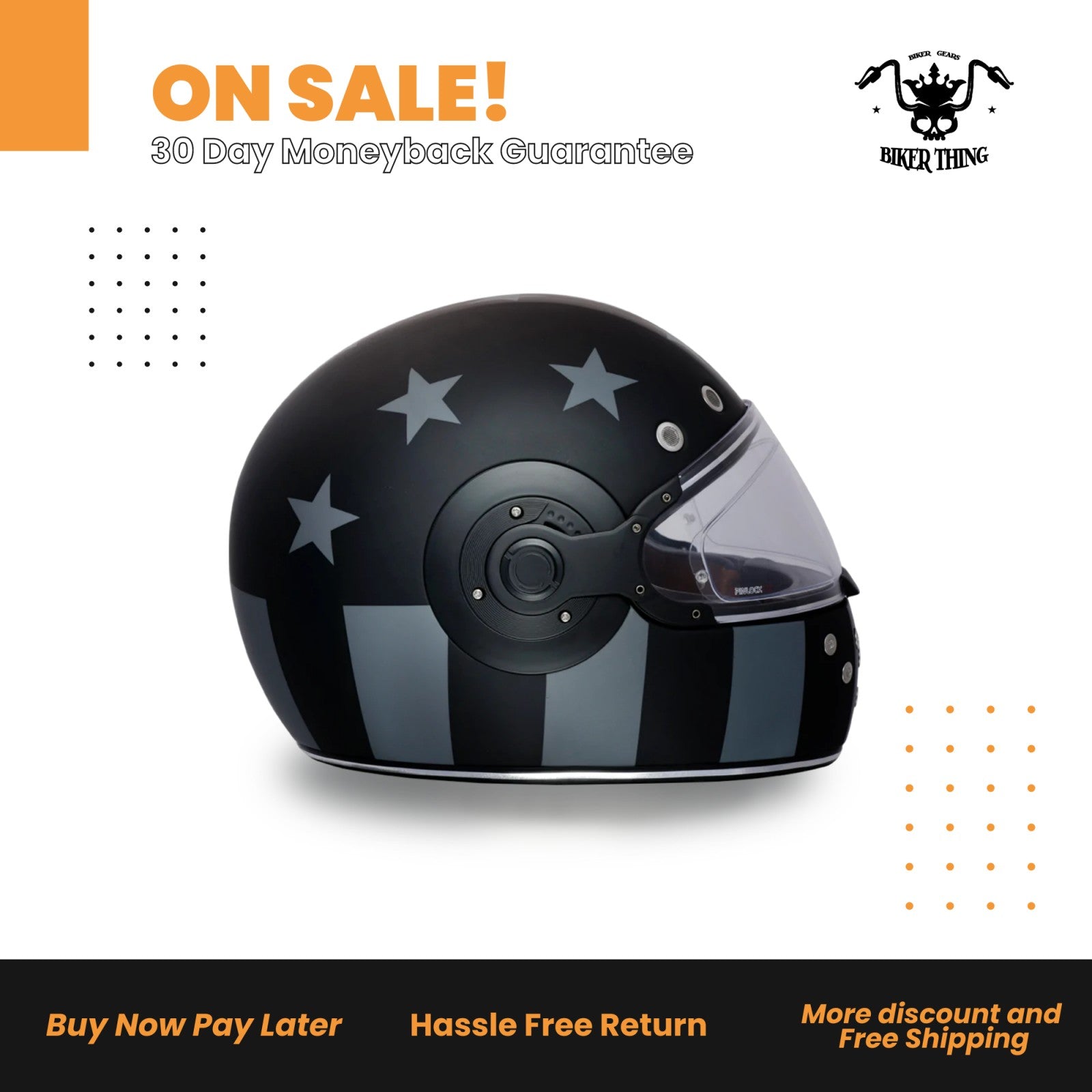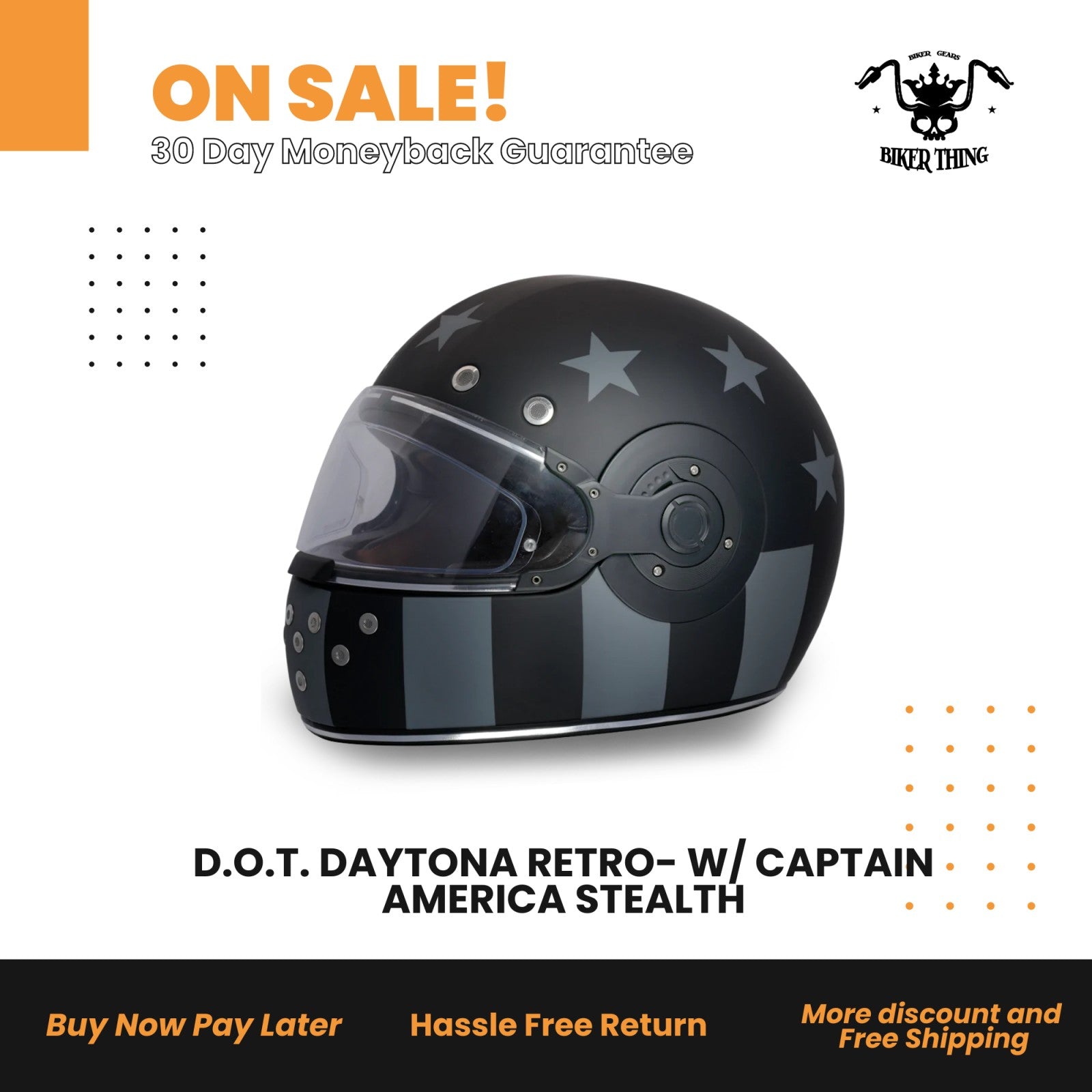 Our D.O.T. Daytona Retro Full Face Helmet In The Captain America Stealth Graphic, Meets And Exceeds D.O.T. FMVSS 218 Standards . With 2 Different Shell Sizes, You're Sure to Get That Proportionate Fit!! The Retro Has The Classic Vintage Look Of Yesterday. Features A Vintage Outer Anti-Scratch Clear Shield With Pinlock 70-R Lens (Anti-Fog). Also Has A Nylon Strap D-Ring Retention System, Chin And Forehead Ventilation And A Removable, Hand Washable Interior (Moisture Wicking Fabric) With Premium Interior Leather Accents. Free Head Wrap And Draw String Bag Included. Sizes Range From XS-2XL