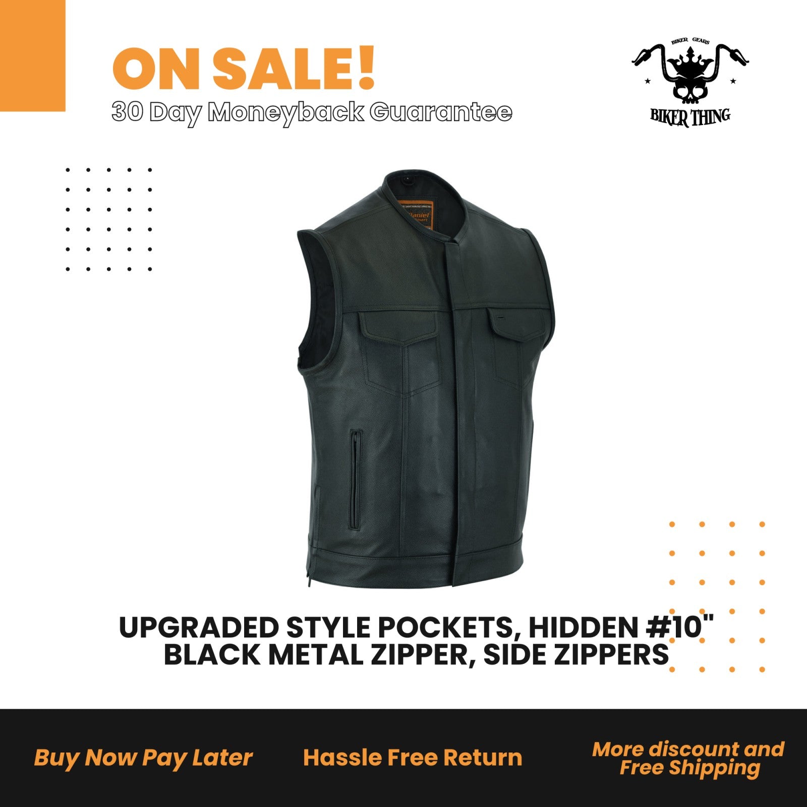 Purchase your men's pocket biker vest with a black metal zipper online today!